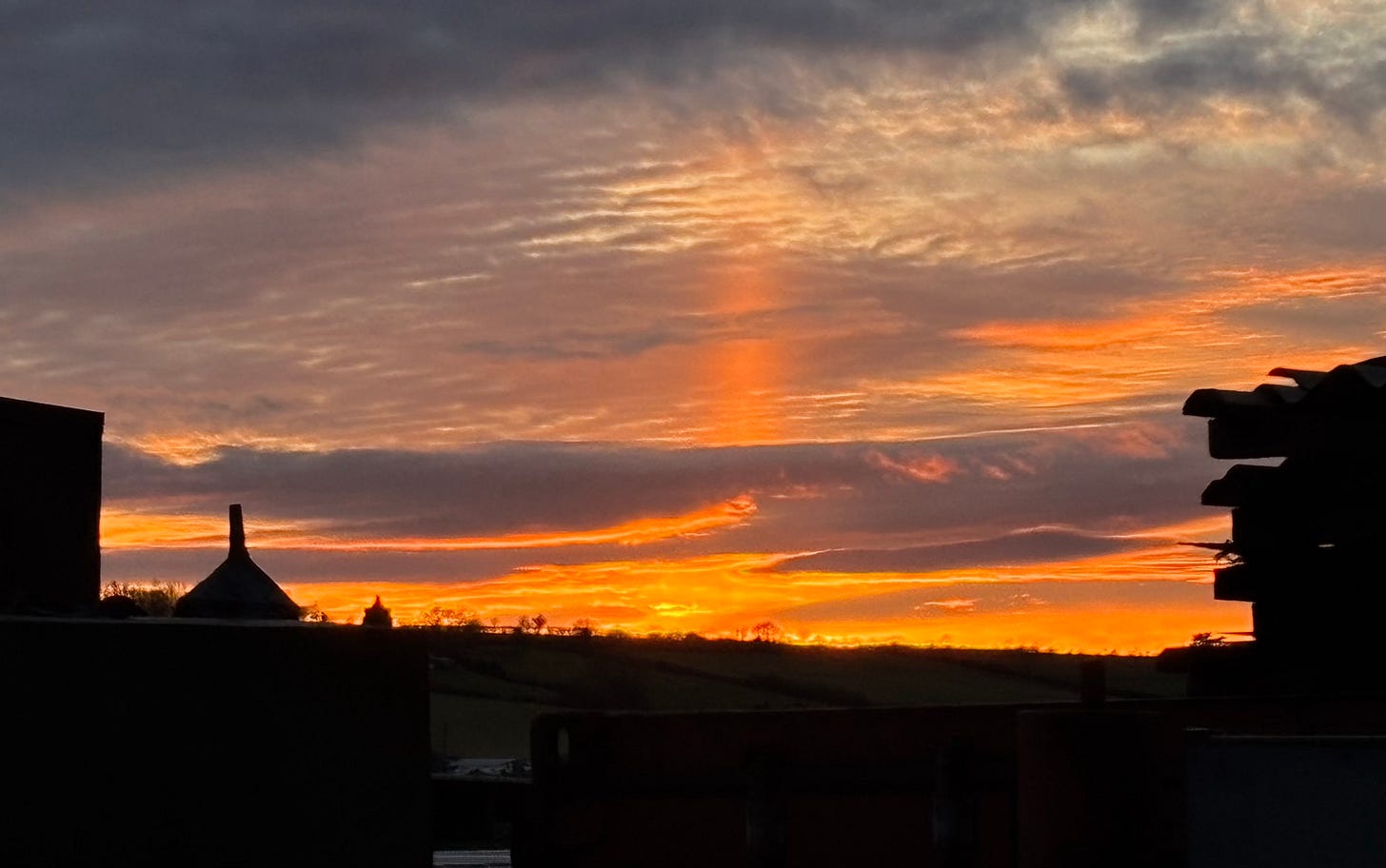 It has such a William Blake feel to it - the golden sun set with a vertical beam of orange light above it and a line of cloud strung across the sky between the two roofs.