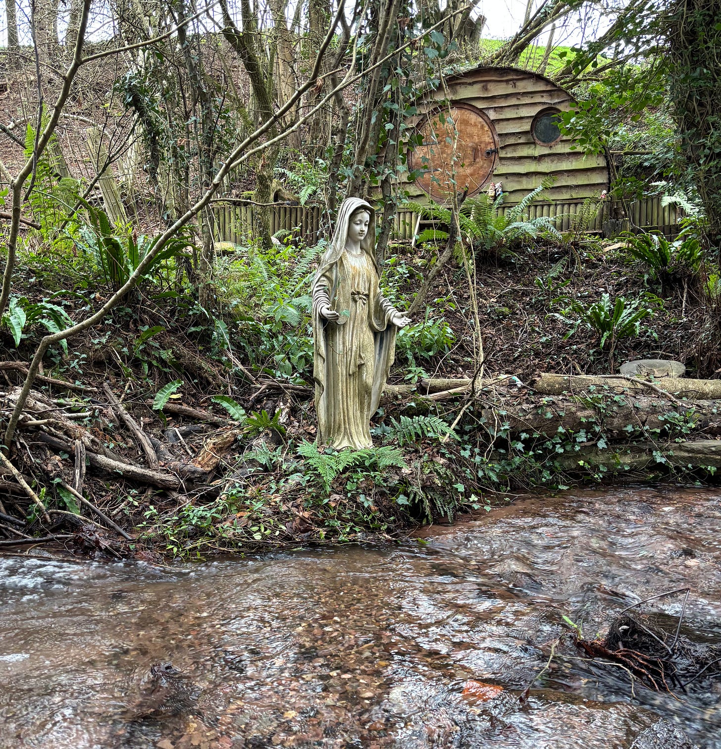 I walk back out from the labyrinth to the stream on it’s edge and on the other side and see, to my great surprise and wonderment, a statue of Mary (I assume) holding out her hands as if in supplication to the flowing waters at her feet (another reference to Pisces, which represent the feet of the human body). I’ve been here before but hadn’t really clocked the statue.